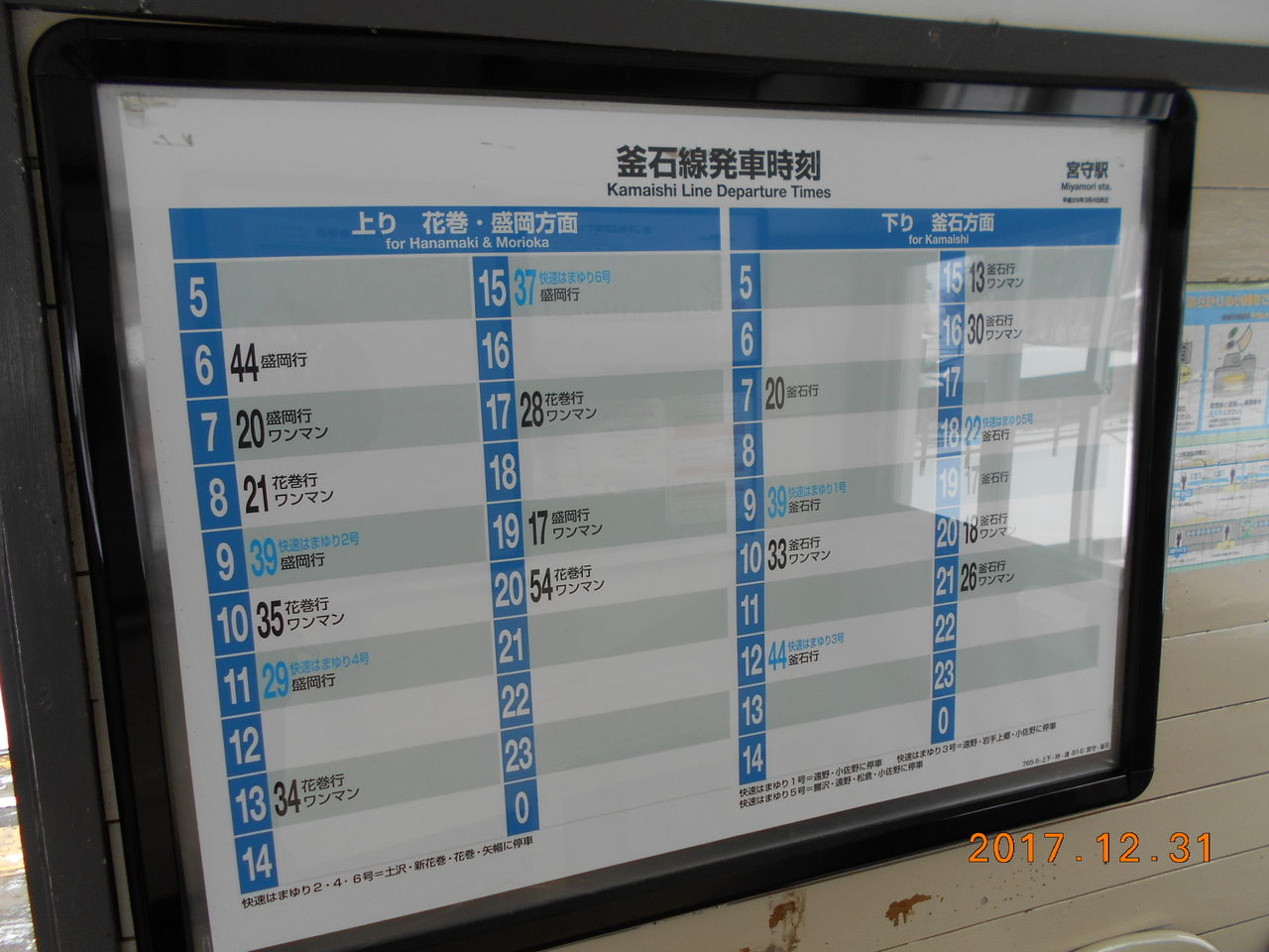 当駅は快速列車が停車するので上り釜石方面行き列車の午前中は手厚く、逆に下り列車は15時以降に手厚いダイヤになっています。↑は2017年12月時点、↓は2022年1月時点の時刻表です。本数に変化はありませんが微妙に発車時間が変更になっています。