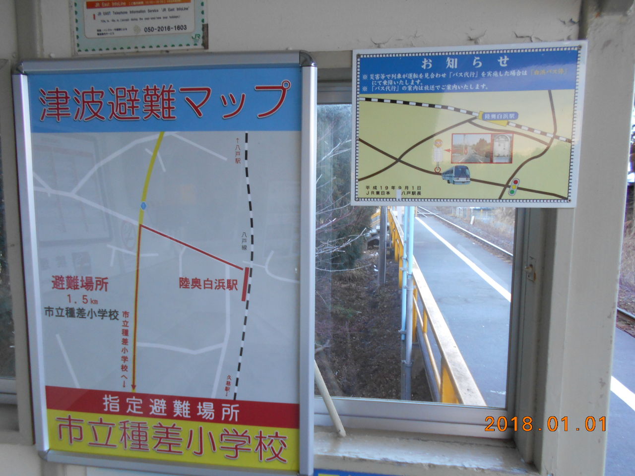 避難所は徒歩約25分の種差小学校です。当駅よりも種差海岸駅のほうが近い(徒歩約15分)ですが、種差海岸駅はこことは違う避難場所が指定されているという不思議な現象。。。