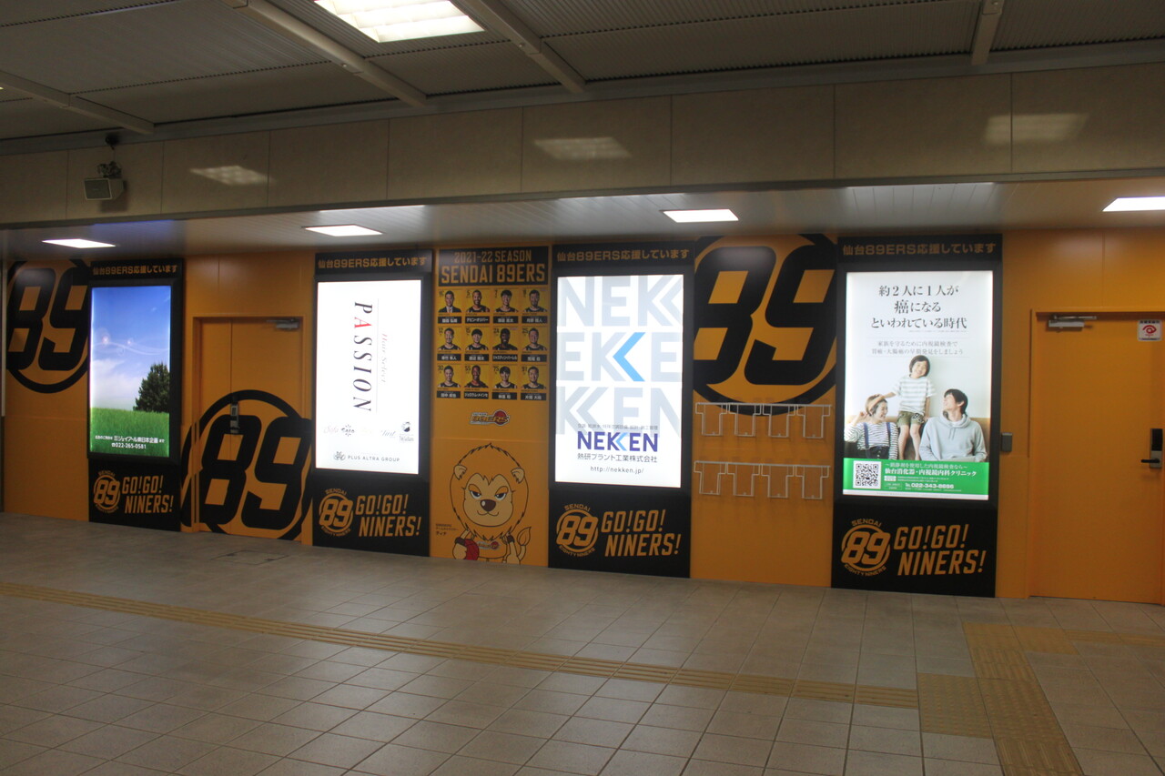 駅構内には近接しているゼビオアリーナ仙台をホームにしている男子プロバスケット・B-Leagueの仙台89ERSをPRする装飾が施されています。