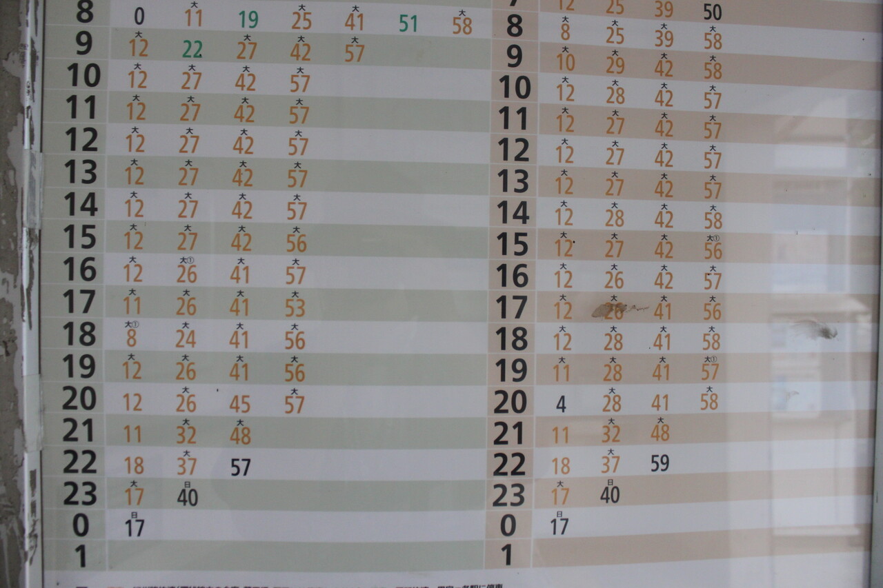 時刻表です。日中は毎時4本が確保されていて利便性は高そうです。