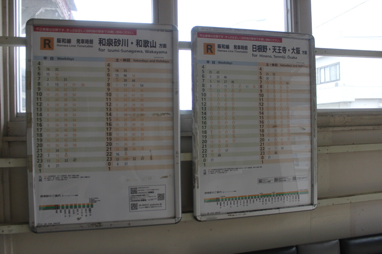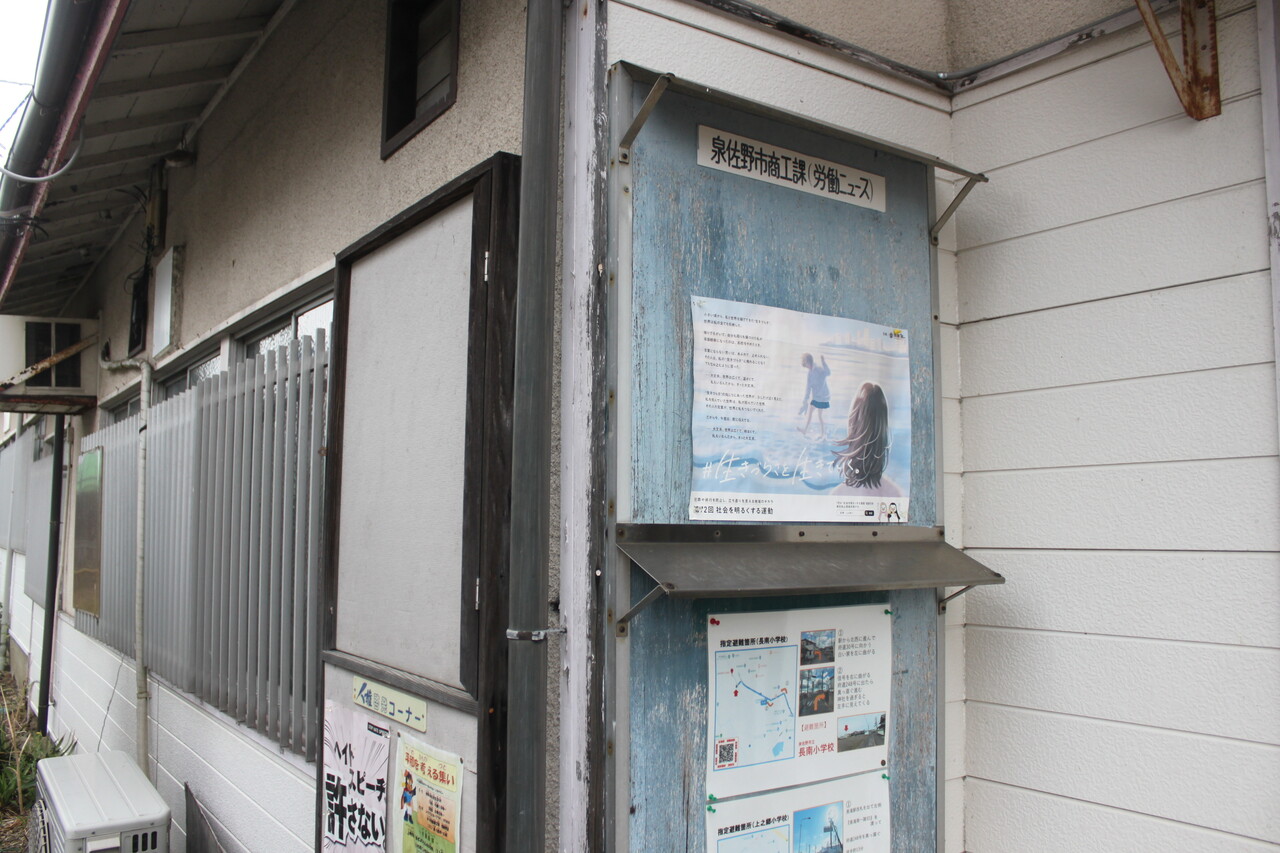 駅舎出入口付近には泉佐野市の広報掲示スペースがあります。掲示板は古そうですが掲示物は更新されているようです。