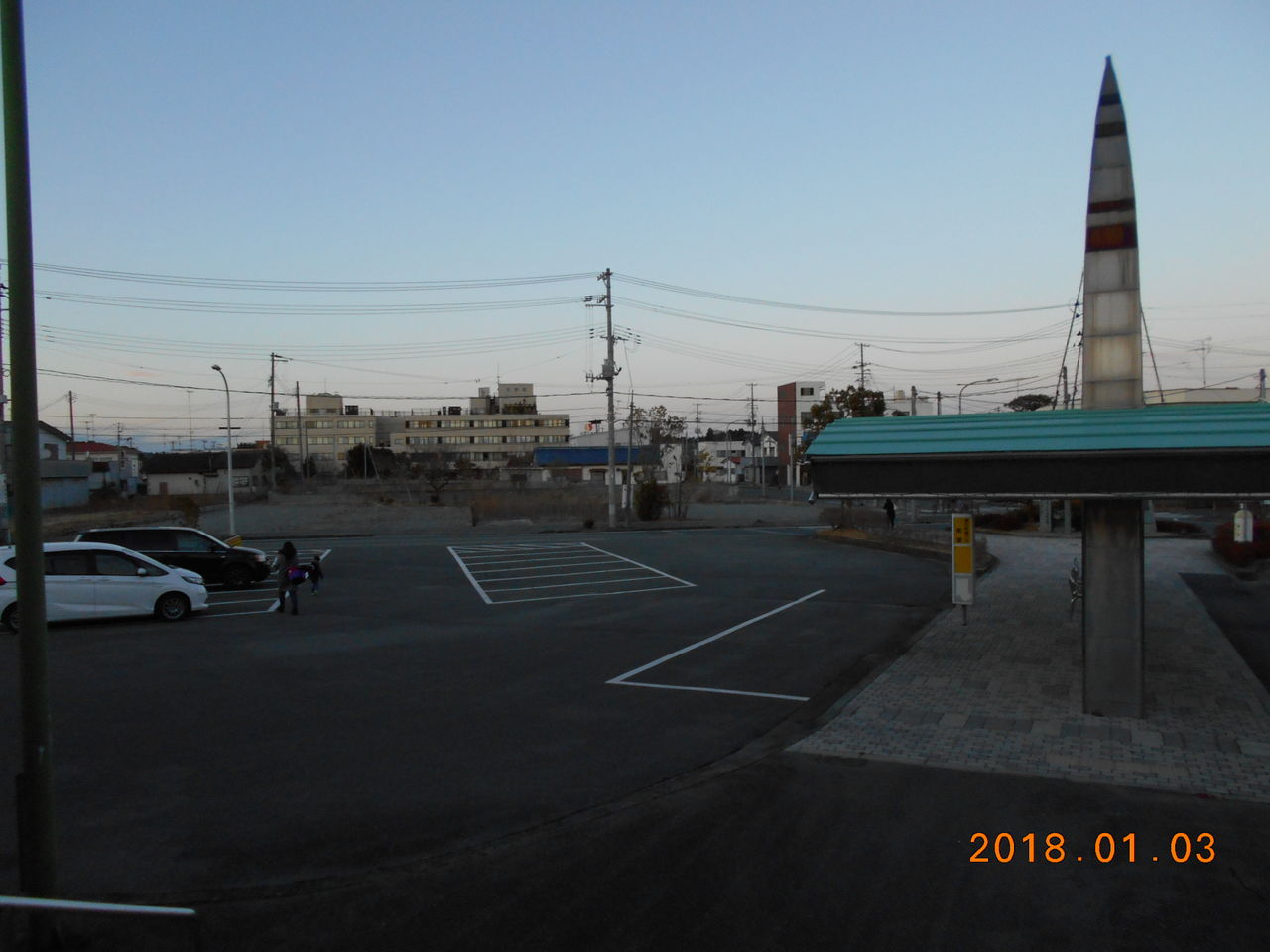 駅舎を背にして外を見た情景です。2017年3月末に避難指示が解除されているものの、訪問した2018年1月に代行バスの車窓から見た浪江の町並みは東日本大震災直後の避難指示が出たまんま。洗濯物が干しっぱなしの民家、2011年3月中旬にオープンする旨を掲示したままのパチンコ屋さんなど、時間があのときから止まったままだったのを思い出します。