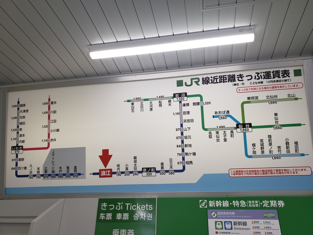 2019年8月訪問時の運賃表です。Jヴィレッジ駅開業後の追加がシールで行われています。