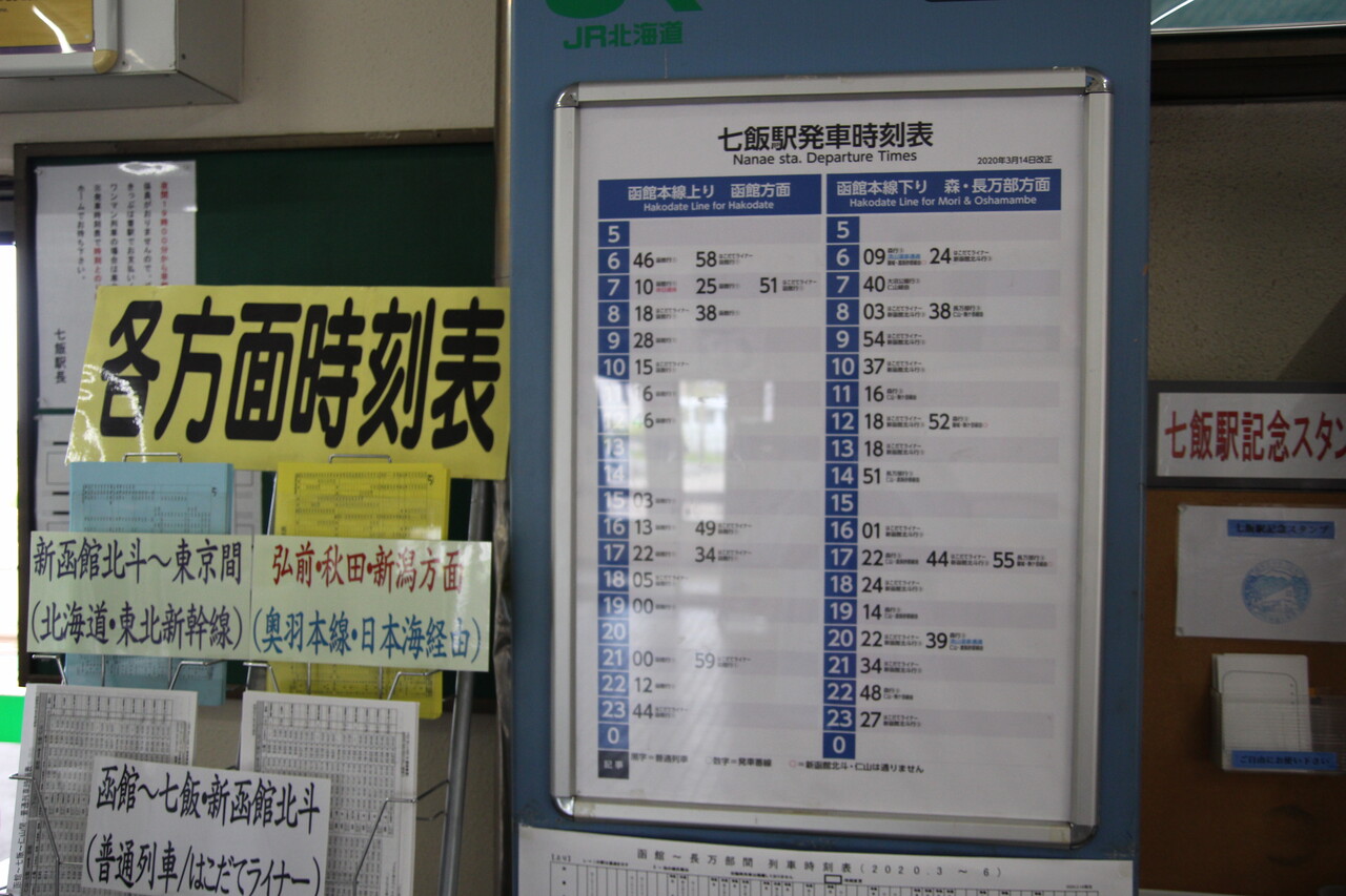 2014年の北海道日本ハムファイターズ七飯町応援大使・小谷野栄一内野手と近藤健介捕手のポスターも駅舎内に掲示されています。七飯町役場は国道5号線の向こう側で当駅から約20分。駅前にはタクシーが常駐していて、お急ぎの場合はそちらもお使いいただけます。