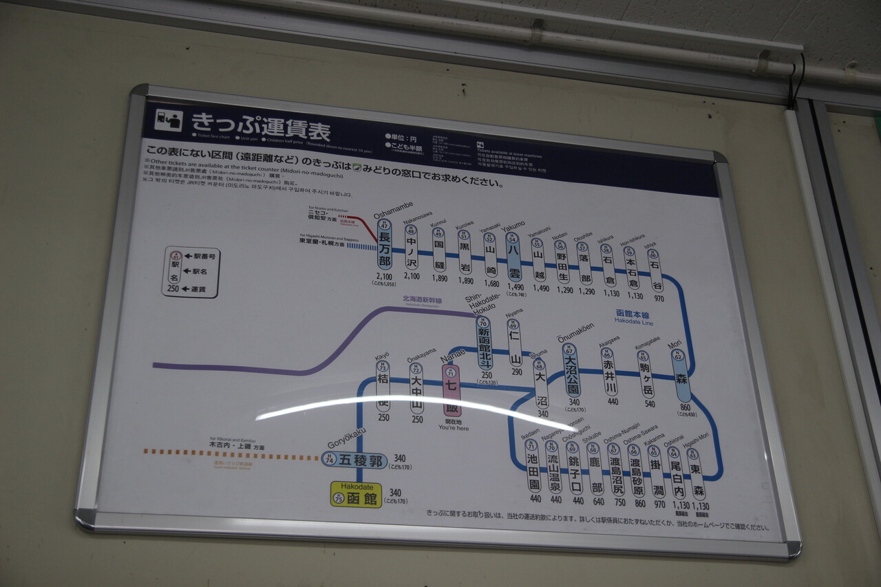 2019年10月の運賃改定以降版の運賃表です。当駅より函館駅までは340円、新函館北斗駅までは250円となっています。