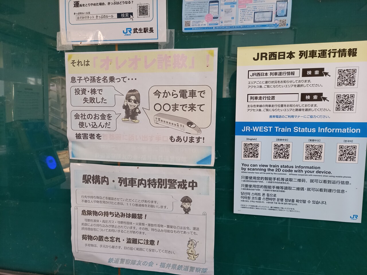 改札脇には乗車時の諸注意を記した掲示物が出ています。このご時世、大量のマッチを持ち歩く人は減ったでしょうね。