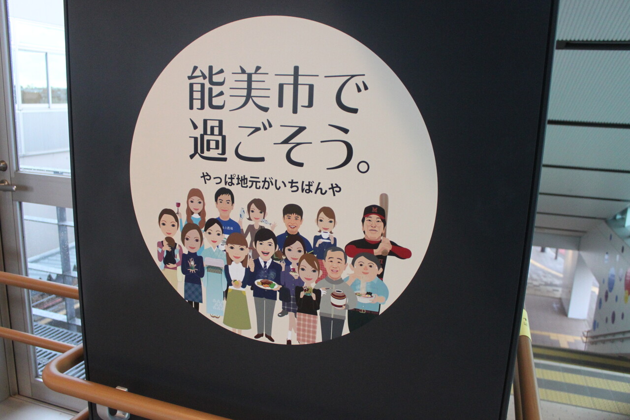 改札前コンコースにはこのような能見市のポスターが。小松駅に新幹線がやってくることをアピールしています。