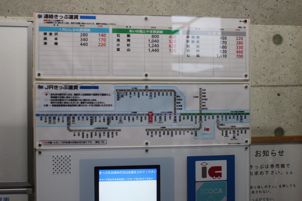 運賃表です。金沢駅までは200円、小松駅までは420円となっています。