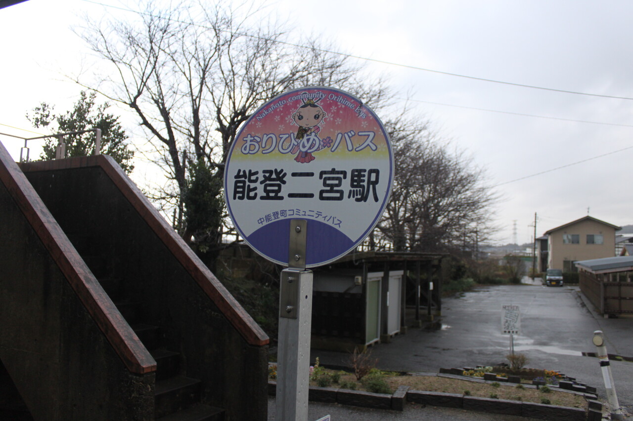 当駅前には地元・中能登町によるコミュニティバス(おりひめバス)の停留所があります。なぜおりひめ?の疑問は公式サイトに答えが出ています。