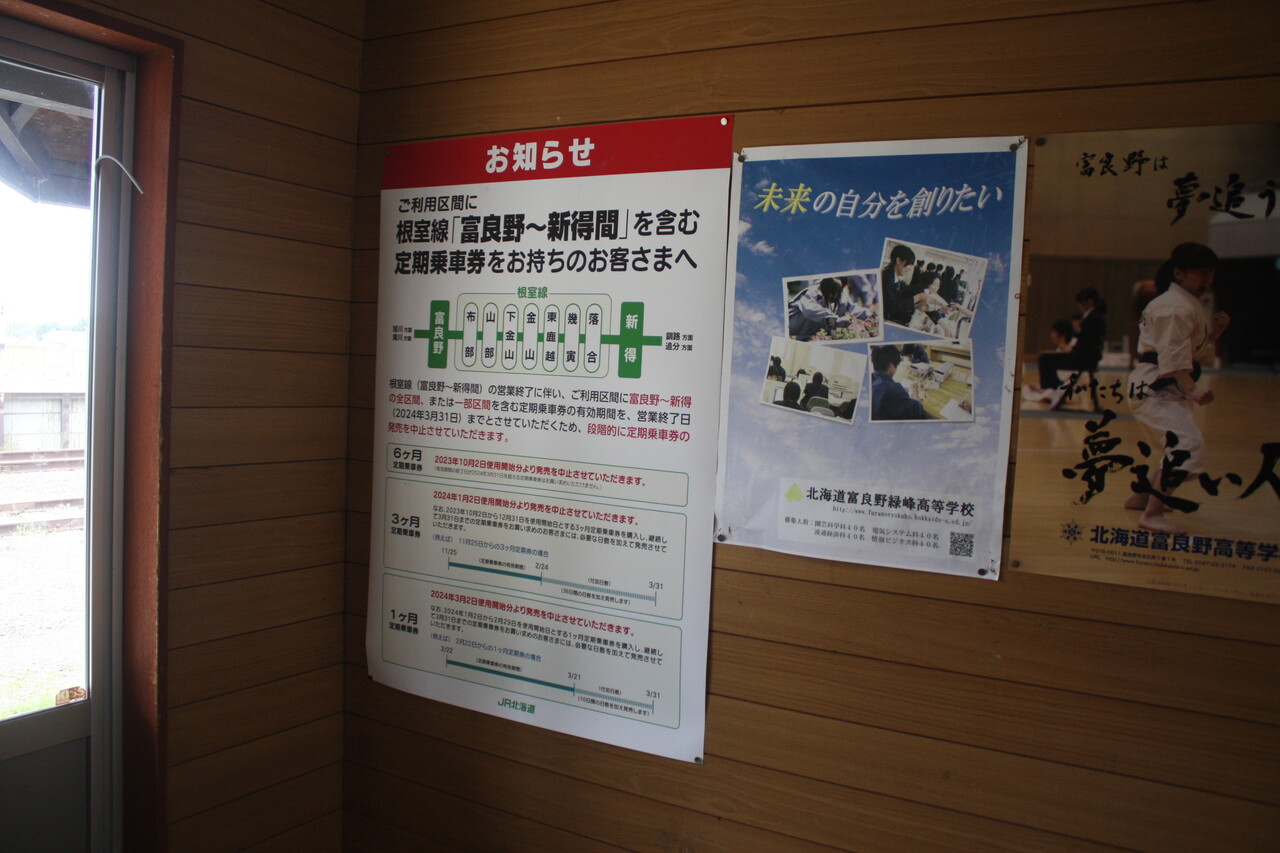 JR根室線の富良野~新得間部分廃止に伴う定期券発売制限を告知するポスターが掲示されていました。