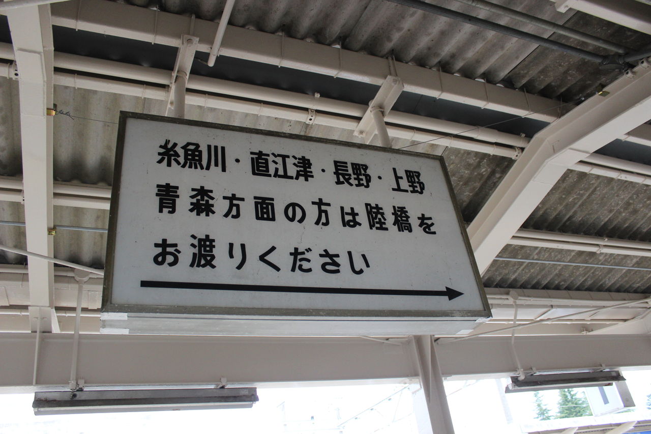ここにも「青森方面」の文字が…どの地名も2015年3月14日以降は自社線ではなくなります(糸魚川はと直江津はえちごトキめき鉄道、長野と上野と青森は東日本旅客鉄道)。といってもこの撮影の時点(2015年1月)でもこの看板の地名では糸魚川しか自社線内ではないのですが。