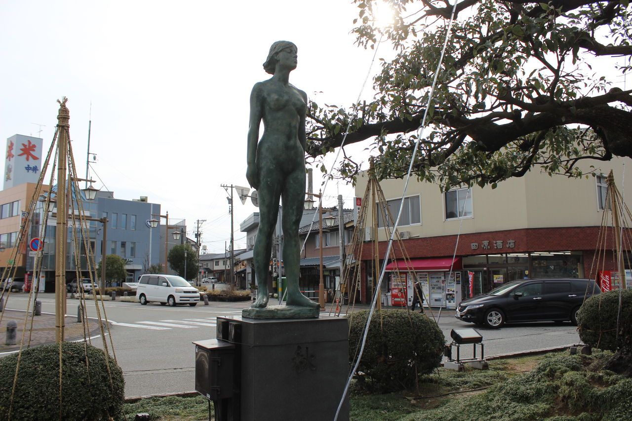駅前には生地駅に続いて当駅にも裸婦像があります。「秋」と言うタイトルの裸婦像ですが、秋に真っ裸ってどういうこと?!
