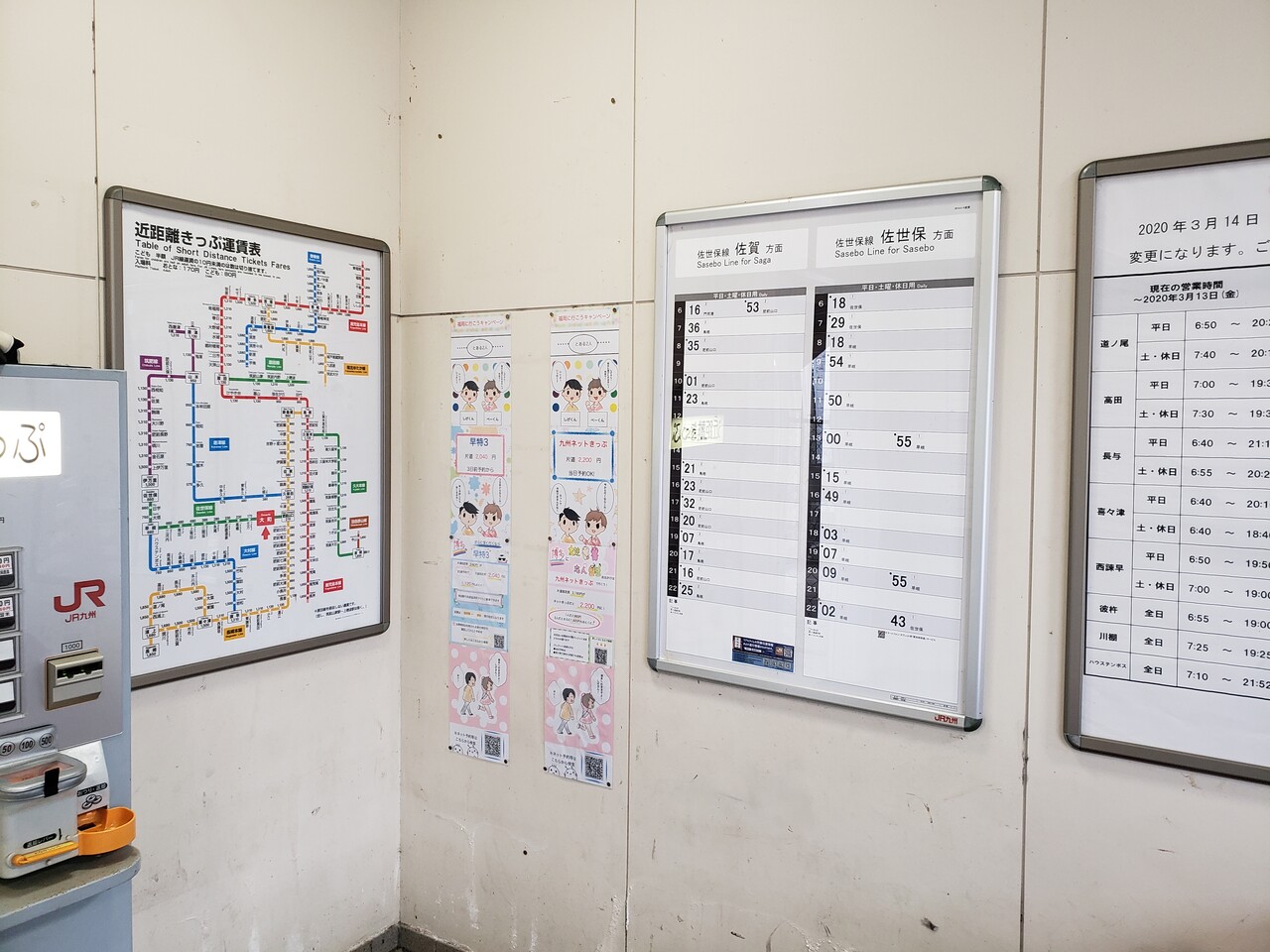 建物内の様子です。ベンチが置かれ、さらに自動券売機が設けられています。券売機から発売されるきっぷには当駅を示す部分が可部線の大町駅と混同を避ける目的で「(佐世)大町」とあります。平成27(2015)年に無人化されていて、窓口跡はシャッターが降りています。