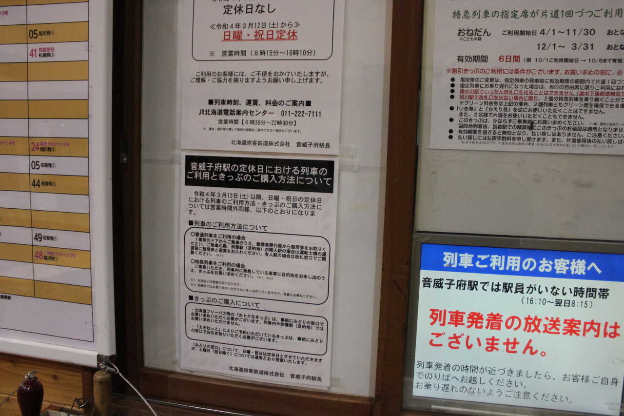 窓口営業についての案内が出ていました。令和4(2022)年春からは日曜・祝日の窓口営業は行わず無人駅扱いとなるようです。土曜日は通常営業(8時15分~16時10分)となっています。