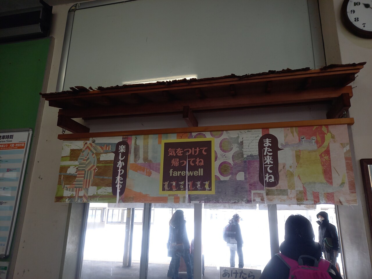 旧改札口には温泉街らしく暖簾がかかっています。当駅を含む簡易委託駅はJR秋田支社の方針なのか、普通入場券のPOS端末発券ができないんだそうで、そういう意味で入場券は不要で出入り自由なのでしょうか。