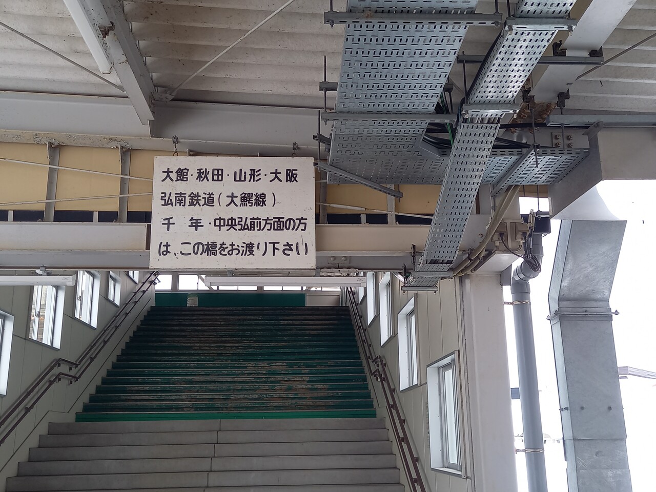 跨線橋は弘南鉄道と共用していて、看板には「大館・秋田・山形・大阪の各地の他に大鰐線の利用者向け表記があります。なお、当駅には大阪行きの特急列車が停車していたことがあります。。