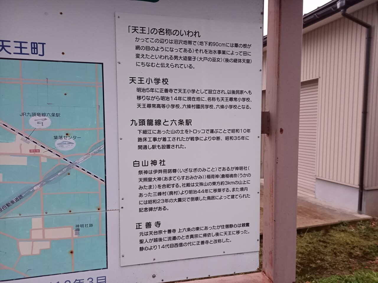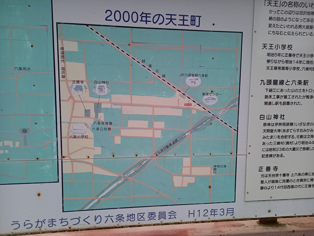 付近には「うらがまちづくり六条地区委員会」が平成12年に作成した「天王町の今・昔」と題した看板がありますが、ここに記されている付近図が興味深いので見入ってしまいます。