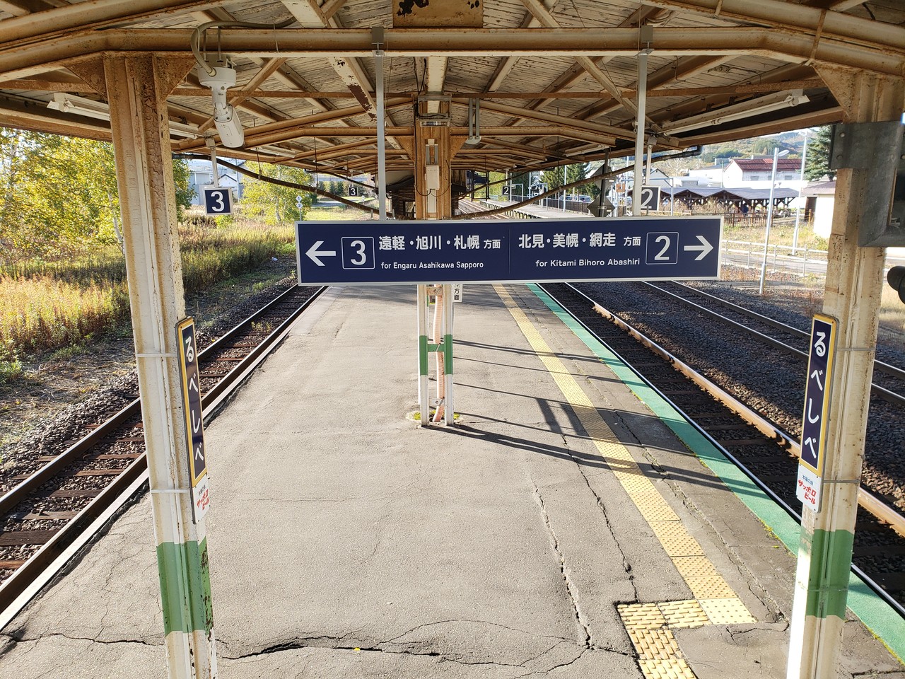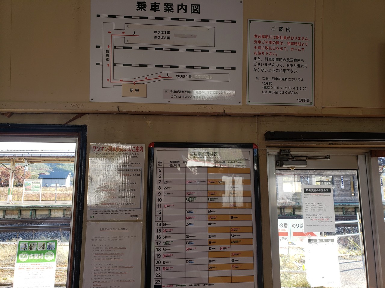 2・3番線ホーム待合室に掲げられている方面案内です。下り列車の行き先に斜里・釧路とあるのは歴史を感じさせますな。