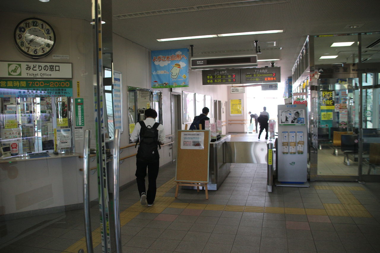 左沢線内はSuica非対応となっていて、自動改札機は設置されておりません。改札口の頭上にはLED式の発車時刻案内がありとても便利。右には待合室が、左にはみどりの窓口があります。