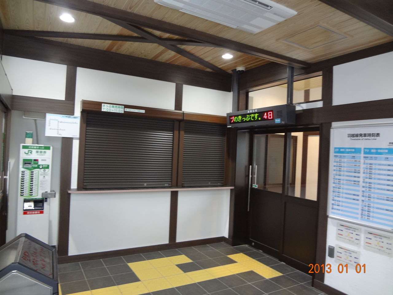 待合室には券売機と窓口があります。訪問時は年末年始期間で窓口がクローズされていました。設置されている券売機は窓口クローズ時のみ稼働し、窓口オープン時は電源はオフになるようです。