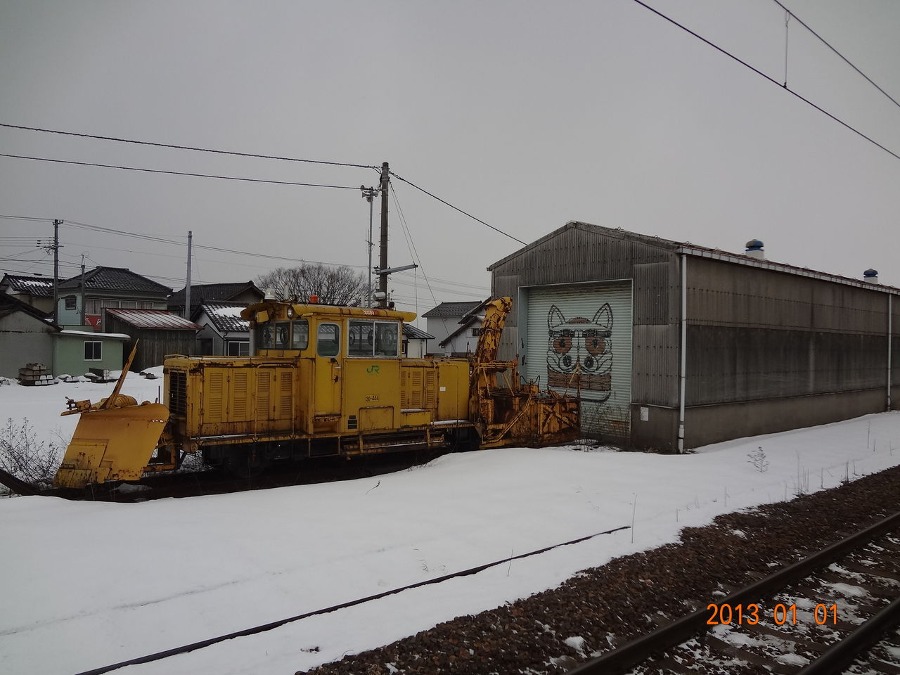 その除雪用モーターカーの車庫のシャッターにご注目。妙に鼻の穴がでかい鬼の面の絵がちょっとお茶目。
