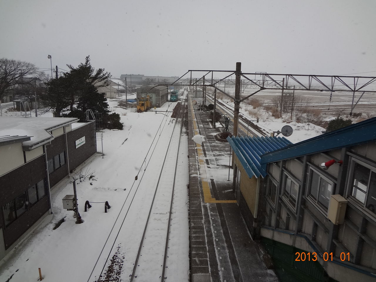 構内は比較的広く、駅舎と上り本線の間には側線があります。恐らく奥に見える除雪用モーターカーの出入りに活用されるっぽい。