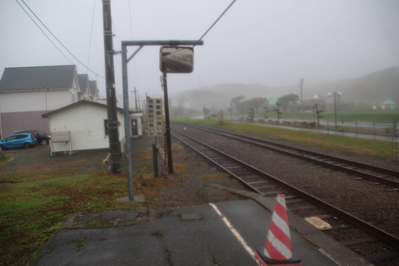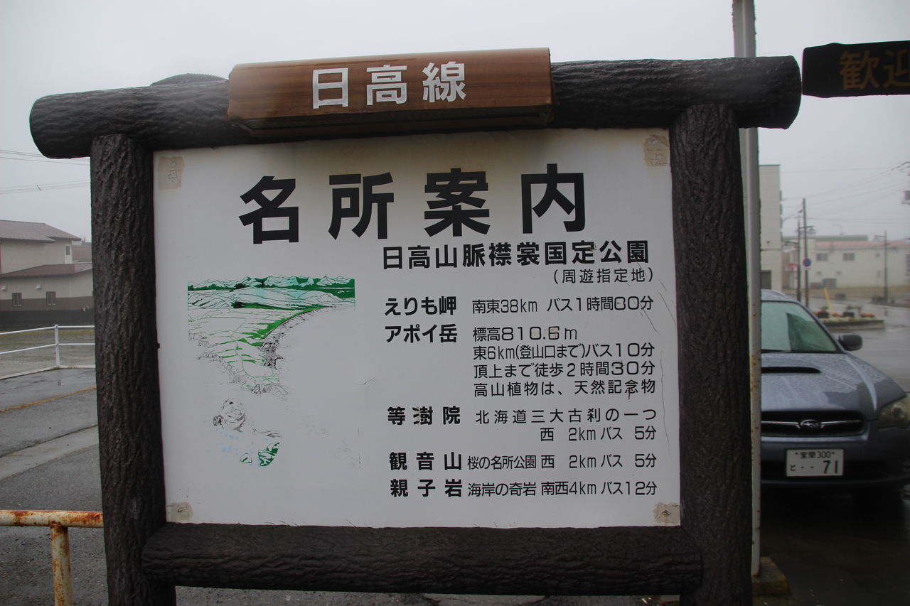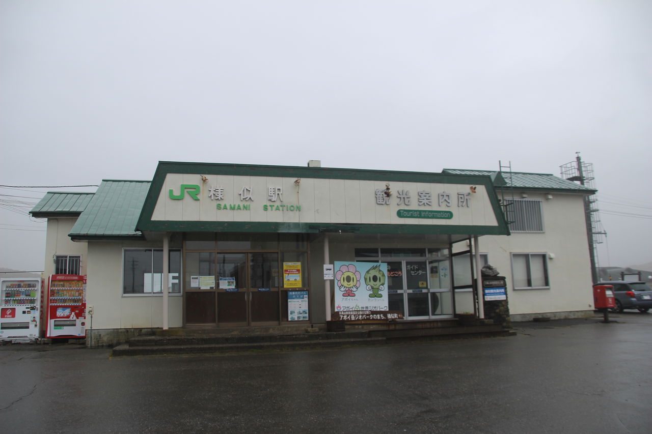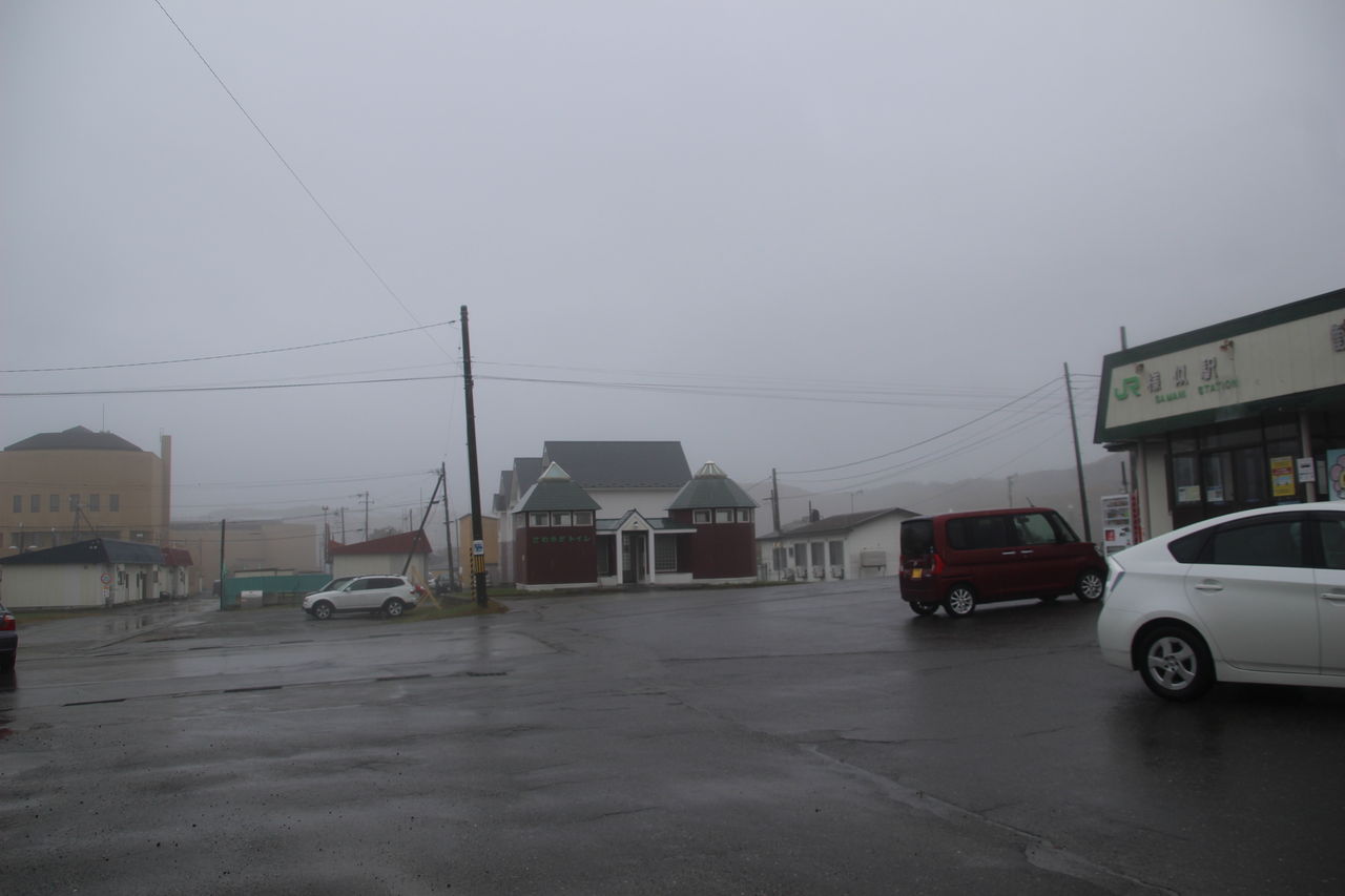 雨にかすんでいて余りよい画像ではありませんが、駅前の様子です。駅から少し離れた国道沿いが様似エリアのメインストリートで、前述のスーパーマーケットやコンビニ(セブンイレブン・セイコーマート)、ガソリンスタンドに町役場などが点在しています。