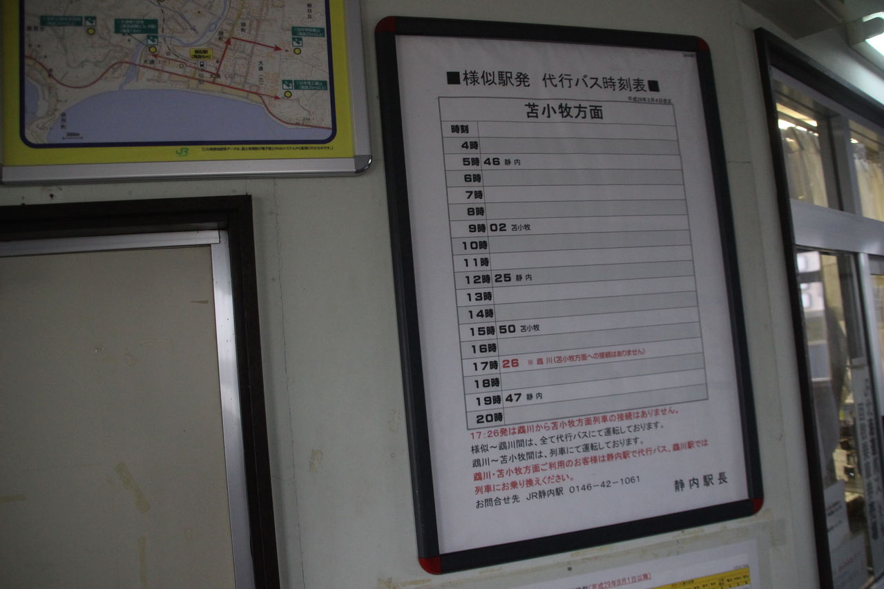 列車代行バスは5時台、9時台、12時台と15時台、17時台、19時台に計6本が静内駅まで運行されていました。前述のジェイ・アール北海道バスさんも当駅から浦河付近までの路線バスを運行していて、6時台から10時台まではほぼ1時間おきに、それ以降は2時間おきにバスが設定されていて、浦河駅までなら列車代行バスを含めるとこのエリアにしてはかなりの高頻度運行が確立されています。