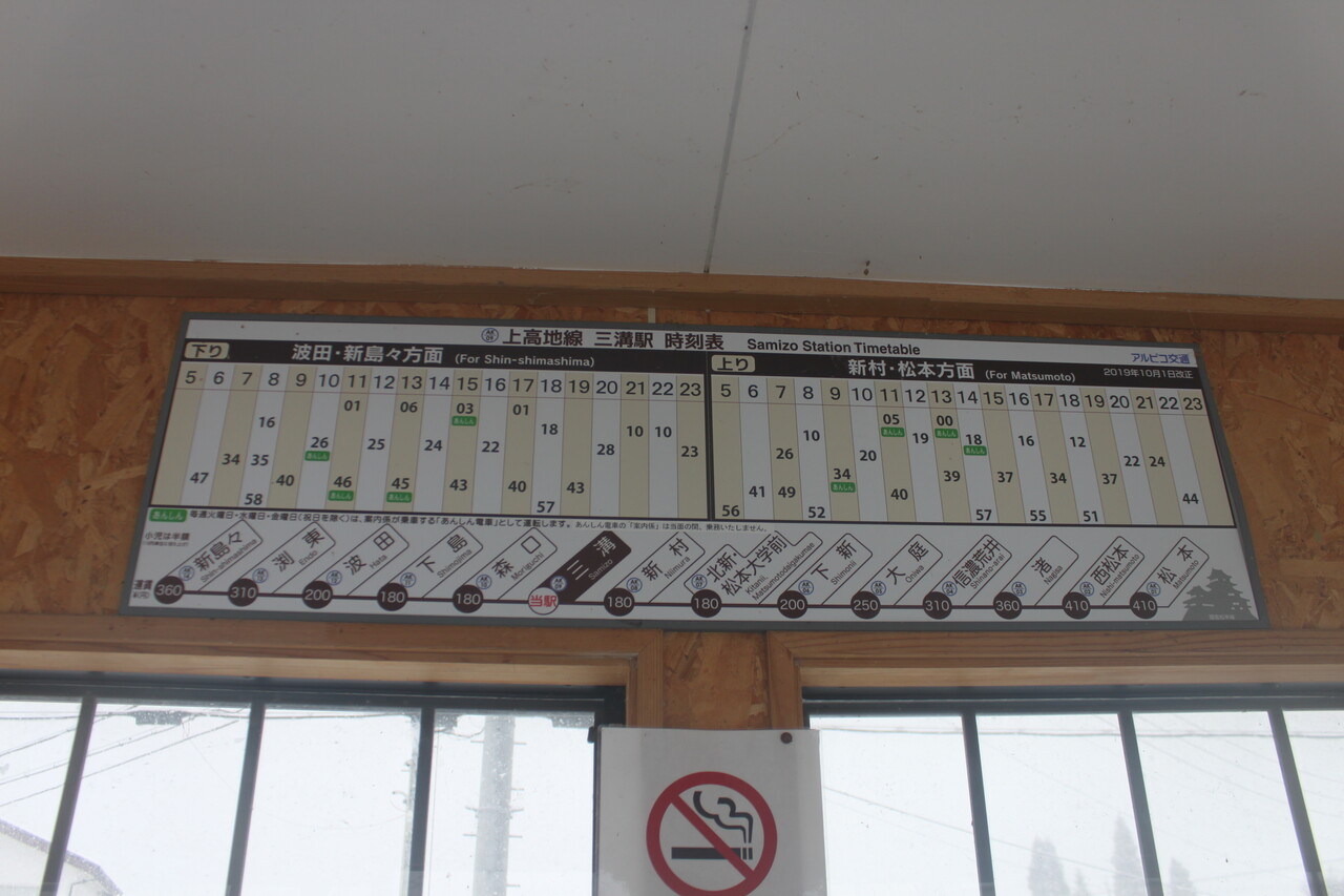 時刻表と運賃表です。当駅から松本駅までは410円、新島々駅までは360円となっています。