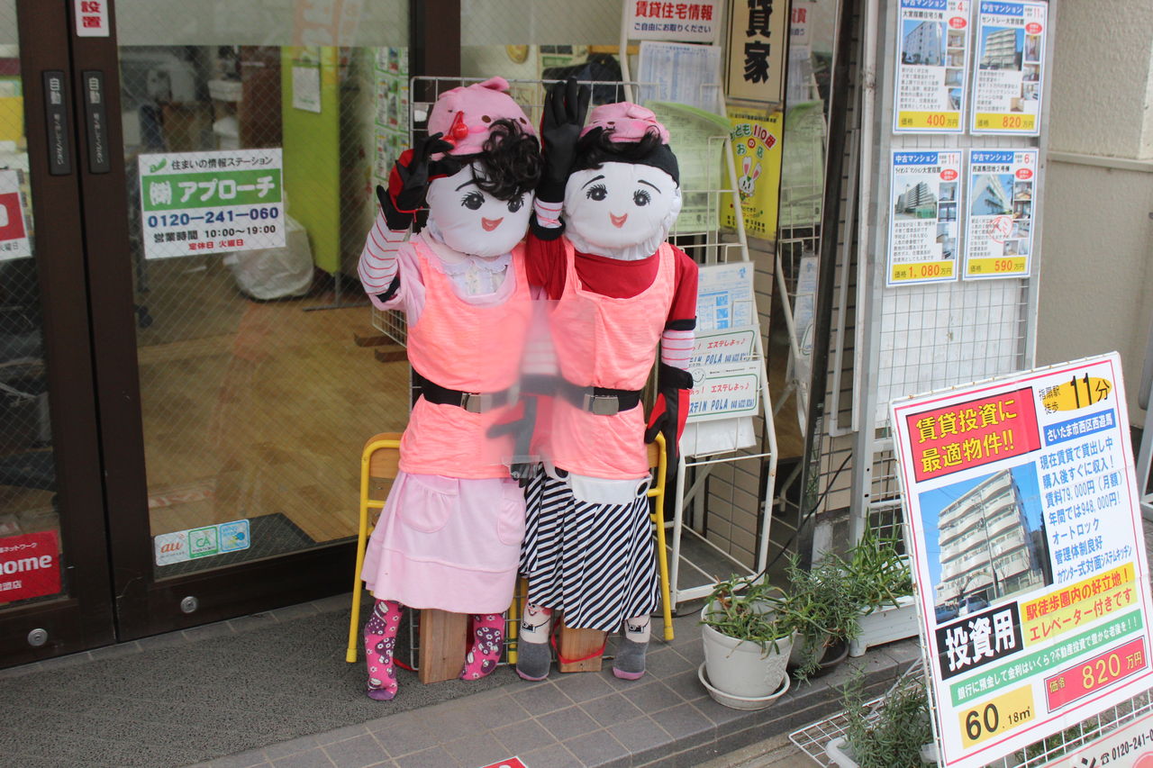 南口ロータリー内にある不動産屋さんには多数の案山子(かかし)が…。