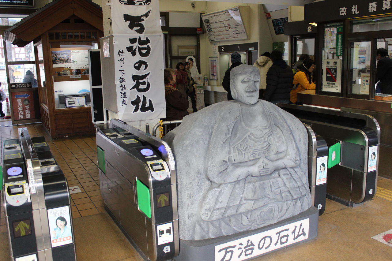 そんな自動改札機に挟まれて鎮座されていらっしゃるのは「万治の石仏」です。本尊は当駅から徒歩25分。バスもあるそうです。それにしても自動改札機のサイズに合わせて鎮座されておられる姿はちょっとシュール。