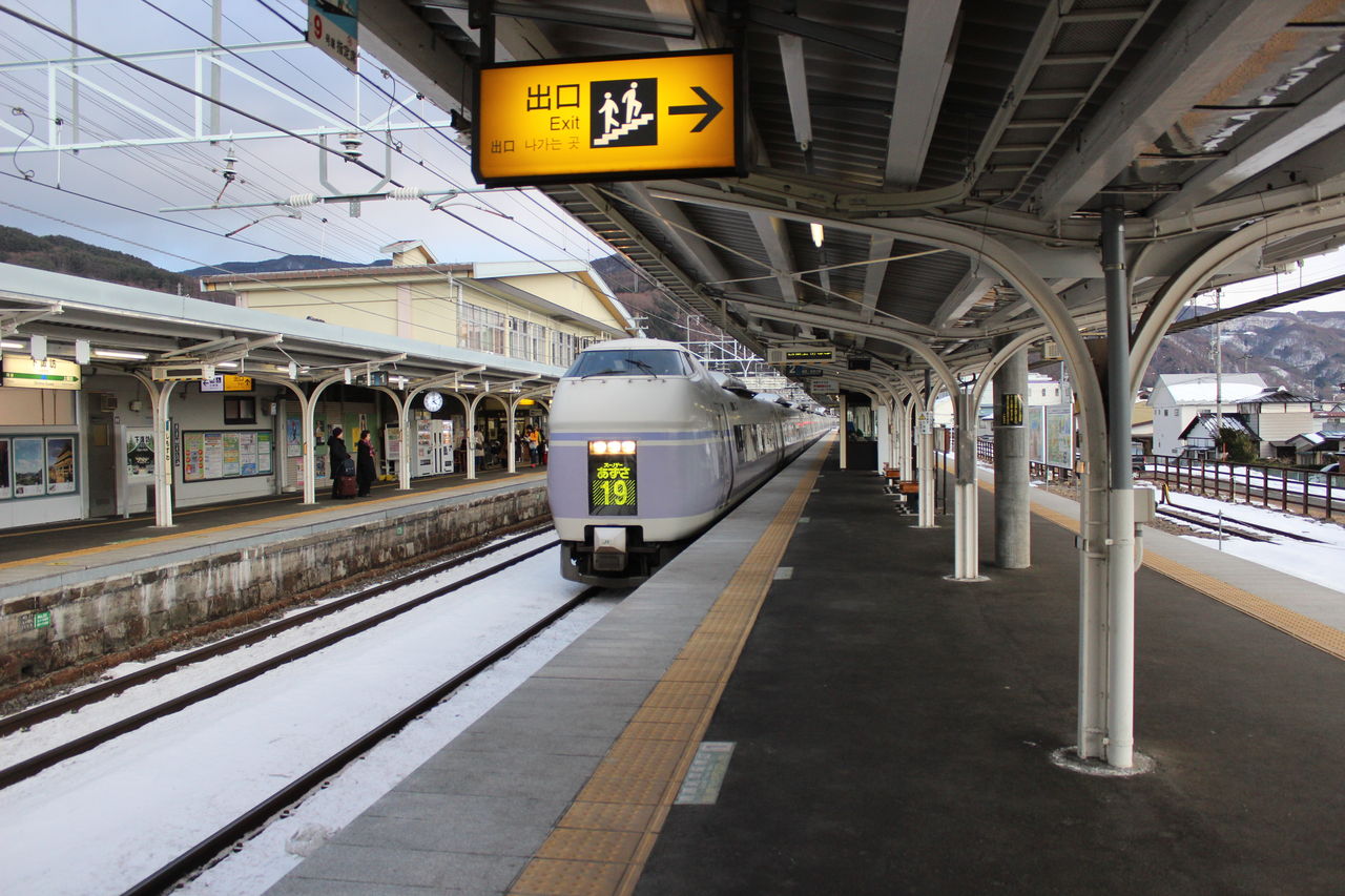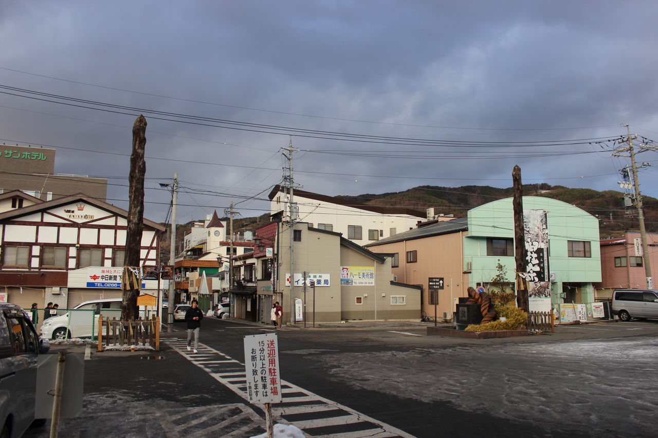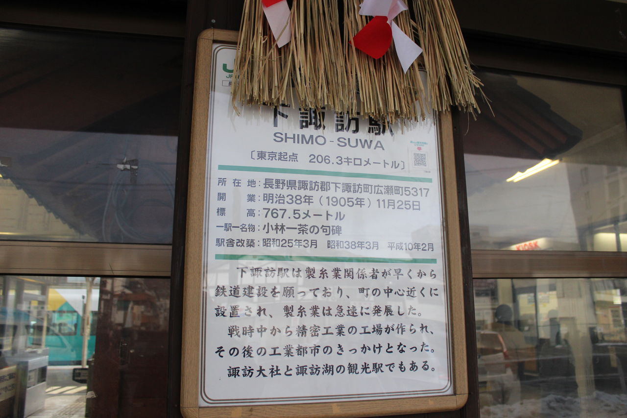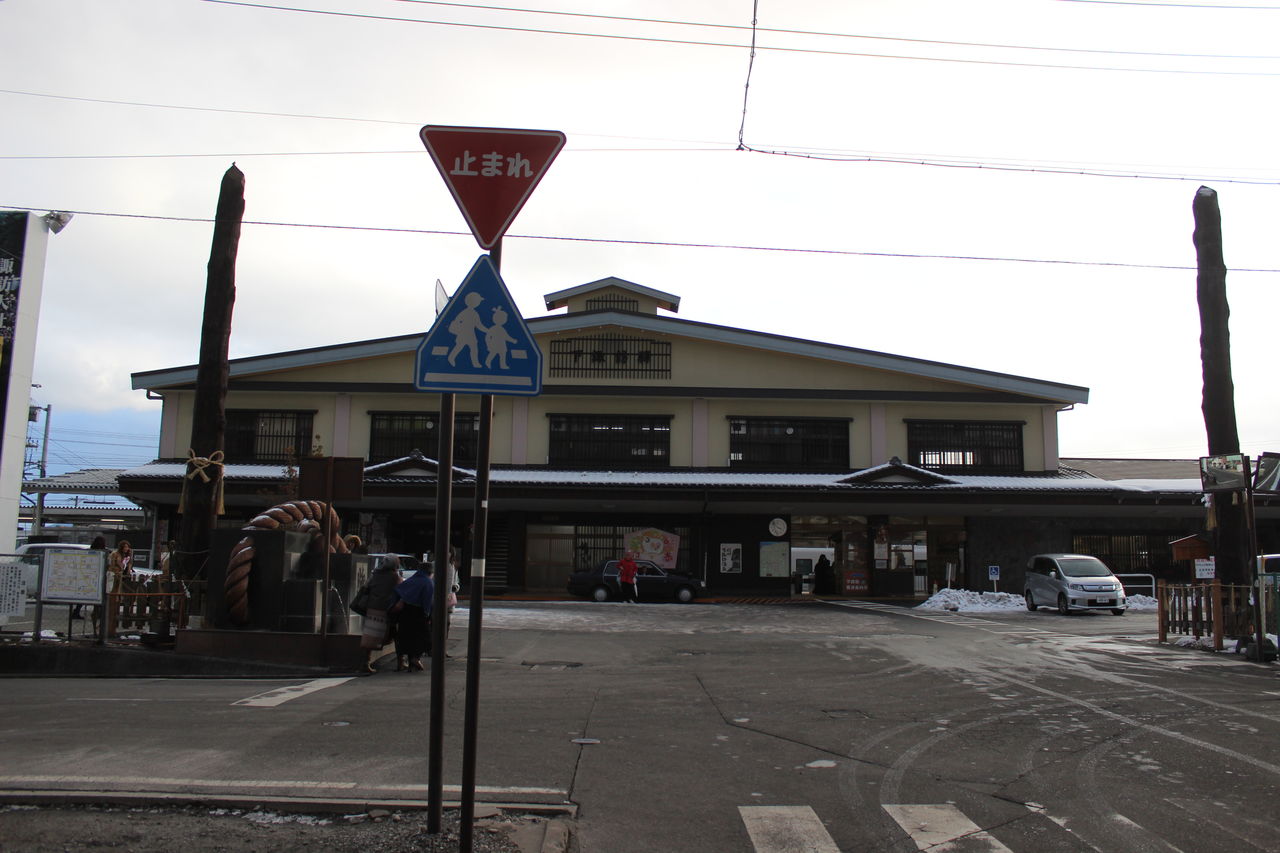 駅前の御柱は1998年の長野オリンピック時の開会式会場に建てられたものなんだそうです。周囲は温泉街でもあり、特急列車が到着するたびに旅館の送迎車が発着する様子が見られます。