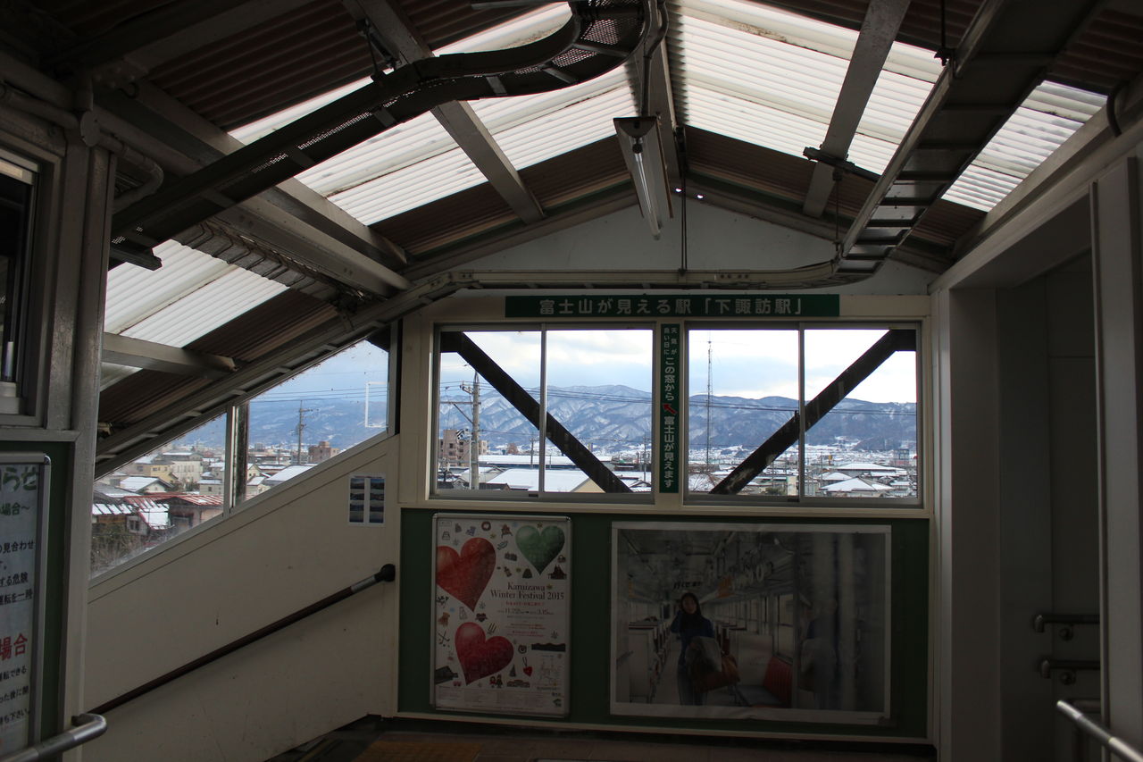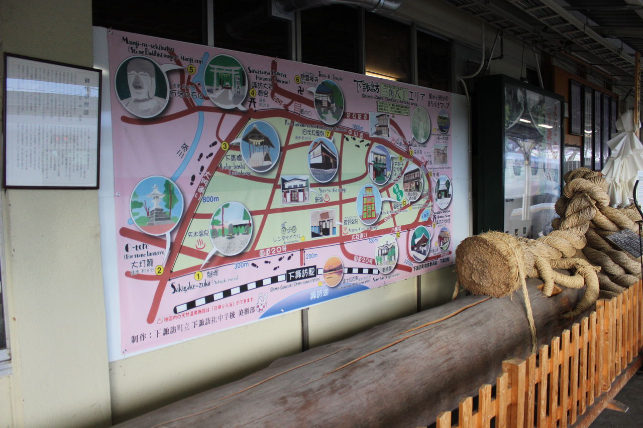改札内には諏訪大社に関わる展示物があり、列車待ち中も飽きさせません。