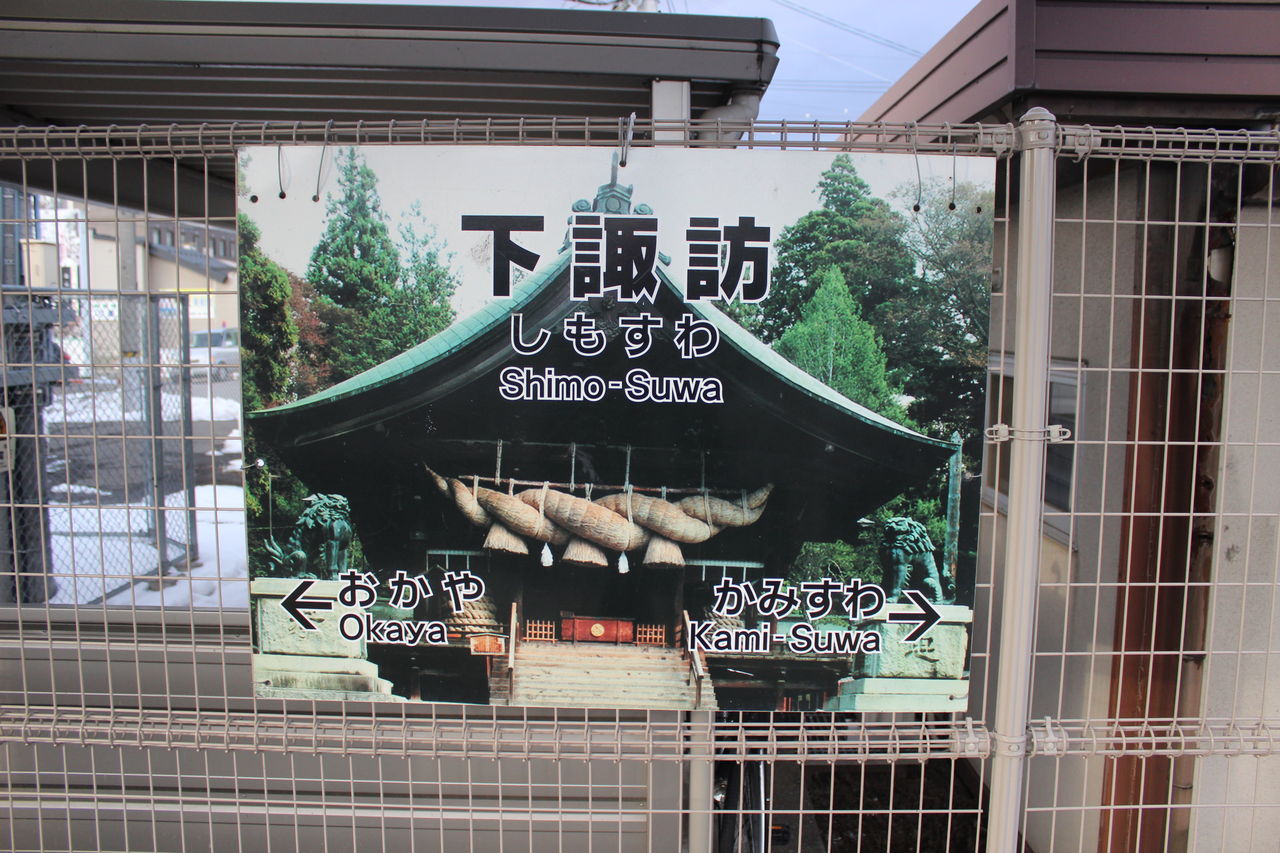 長野支社お得意の「ご当地駅名標」、当駅は諏訪大社の社殿です。