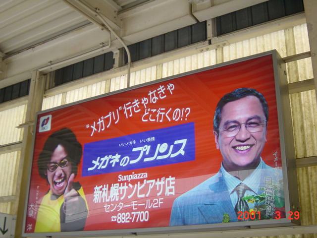 2001年訪問時の1番線の某メガネチェーンの広告看板(大泉洋氏と日高晤郎氏)ですが、2016年現在は同じ広告主ですがデザインが異なっています。