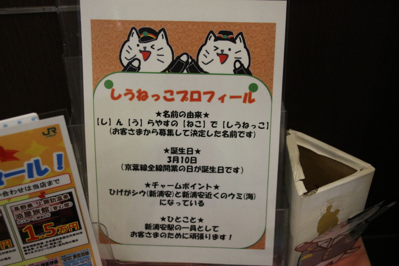 「しんうらやすのねこ」なので「しうねっこ」と名付けられたそうです。お髭にご注目。よく見回すとアチコチに点在しているので探してみてください。仙台駅の「トキむねくん」や蒲田駅の「かまどん」、大宮駅の「まめお」と「まめこ」のように駅独自のマスコットを作るのは個人的にはいい試みかと思います。