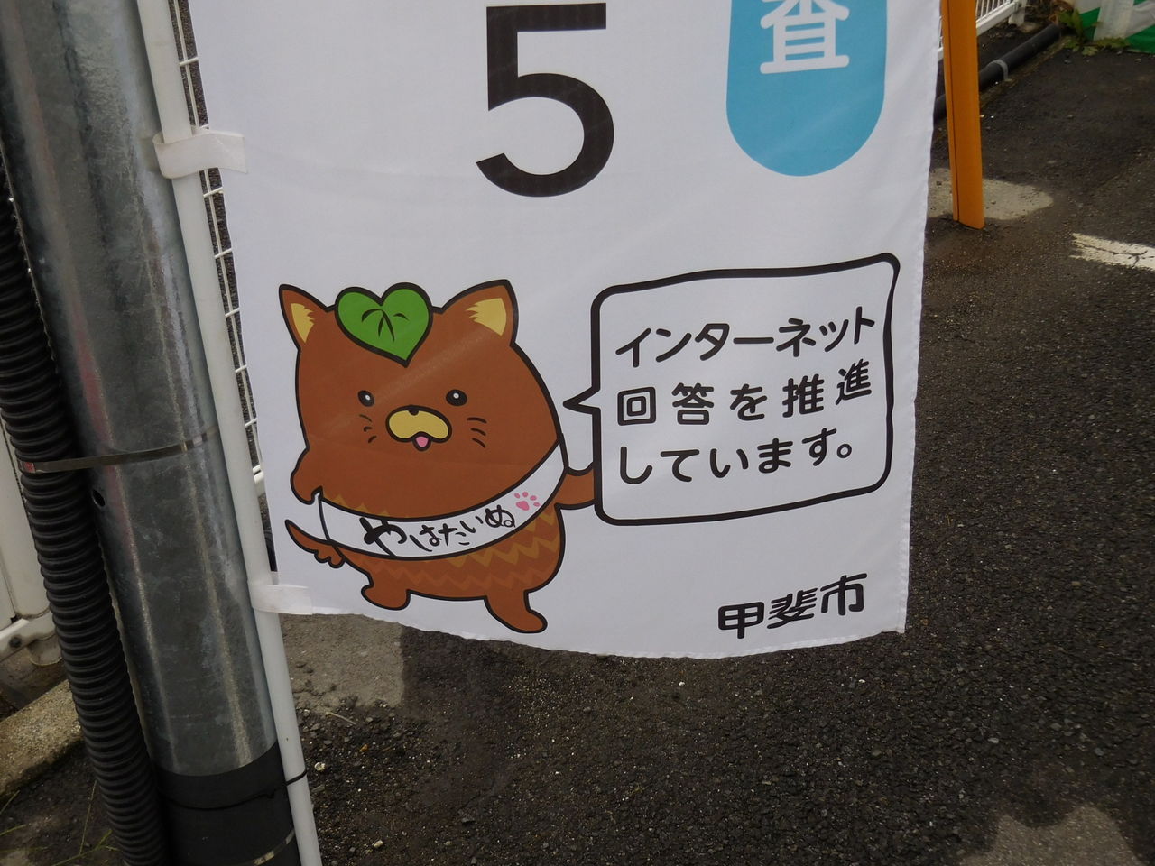 国勢調査の協力を促す幟にも描かれていました。このゆるキャラは「やはたいぬ」といいうようです。