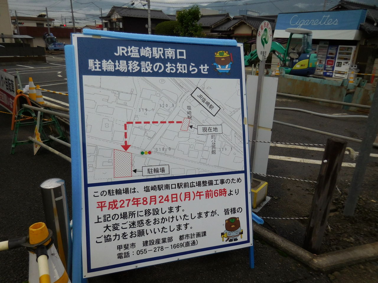 駅舎リニューアルに伴い駐輪場が動いていました。この看板には甲斐市のゆるキャラが描かれています。