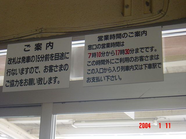 営業時間のお知らせが掲出されていました。この時は7時10分から17時30分までの窓口営業でしたが、これは駅係員配置末期まで同じだった模様です。