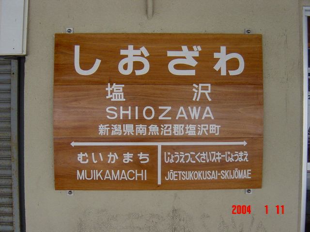 2004年訪問時、当駅には大沢駅に設置されていたものと同様の木製駅名標が設置されていました。大沢駅の木製駅名標は2014年訪問時に撤去されJR東日本様式のものに交換されていました。恐らく上越国際スキー場前駅の英文字表記が「Joetsukokusai-skijomae」となっていることが撤去の要因なのかなと。。。