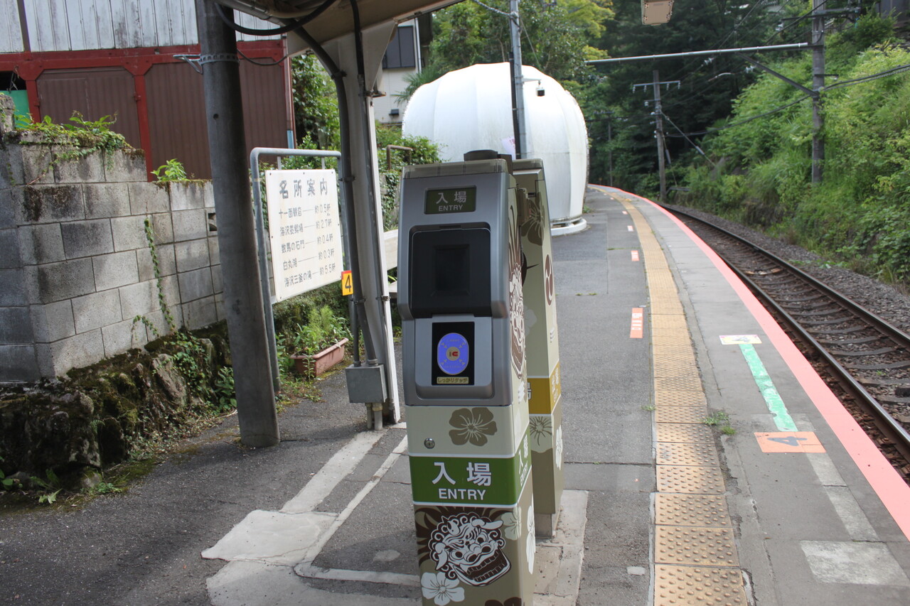 駅頭の建屋には平成29(2017)年1月まで稼働していた自動券売機(ICカードチャージ機能付き)が撤去され、その跡地に乗車駅証明発行マシーンが置かれています。