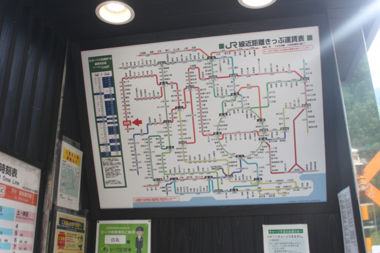 運賃表です。ピンボケでわかりづらいですが、奥多摩までは150円、青梅までは320円(IC:318円)、立川までは660円、新宿・池袋までは1,110円、東京までは1,280円となっています。余談ですが拝島駅で西武線へ乗り換えると高田馬場でJR線へ戻るルートでも池袋までは100円程度安くなります。