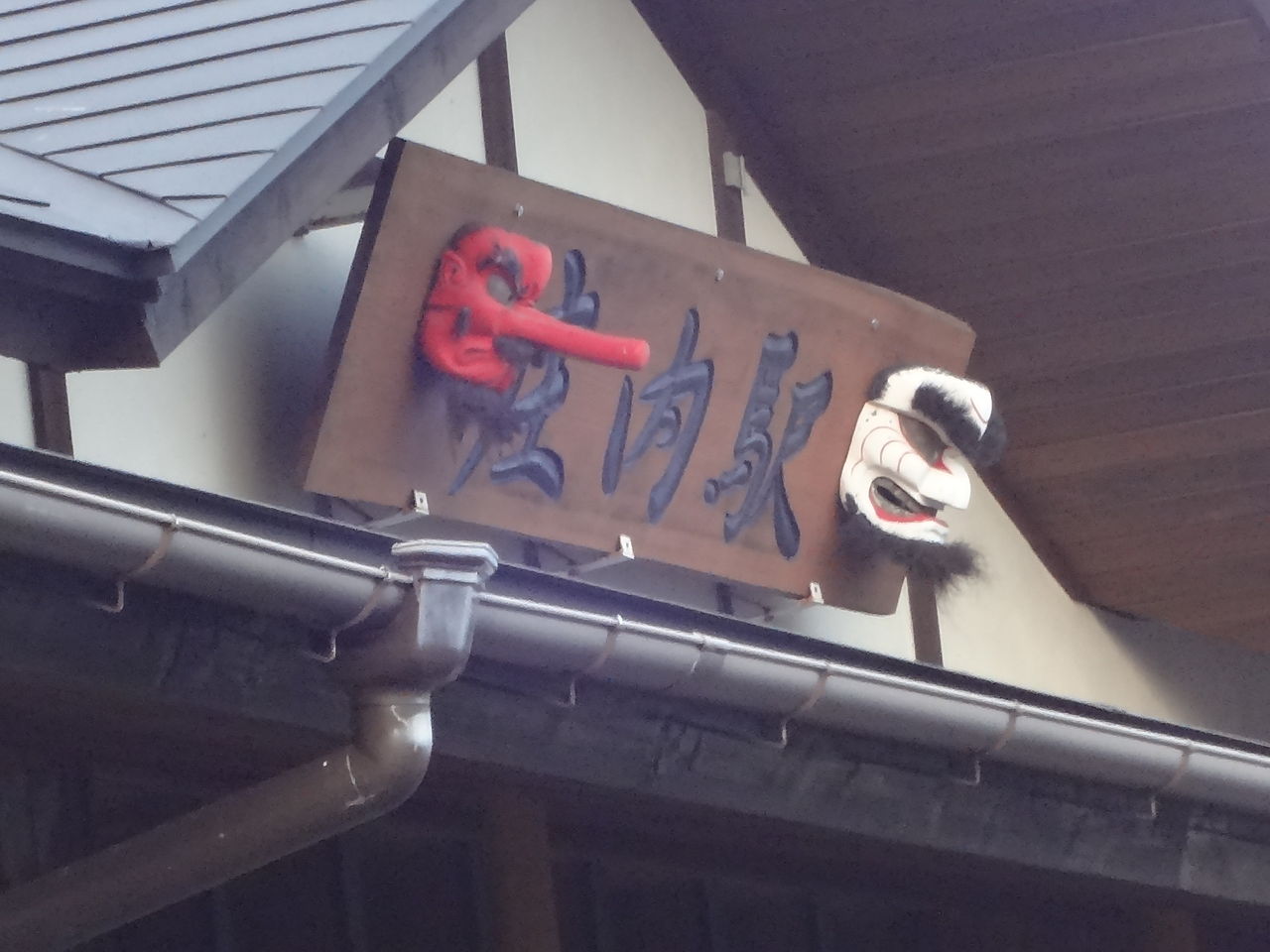当駅舎の看板にご注目。見事な天狗のお面です。