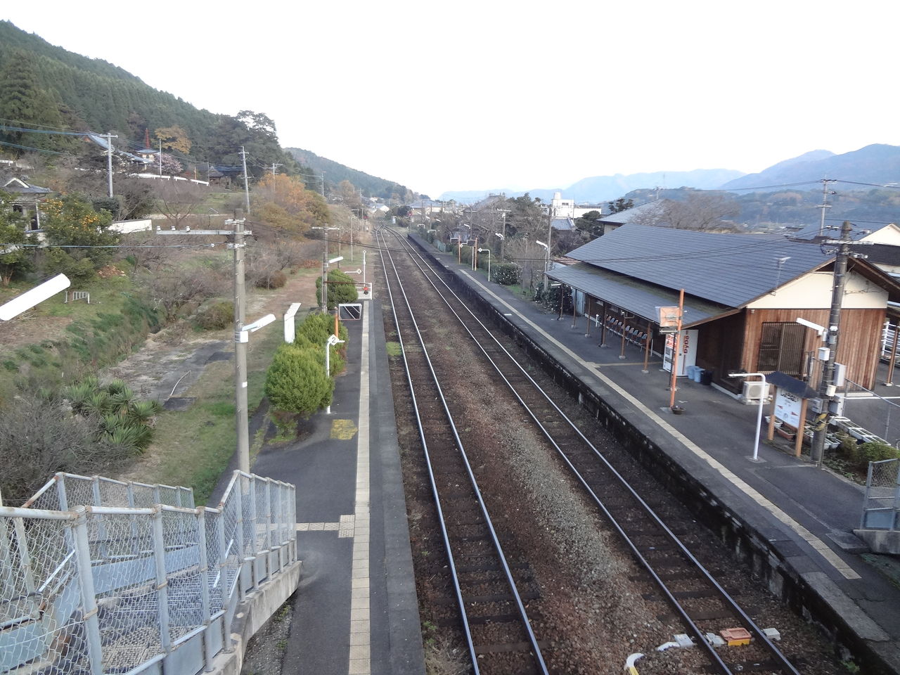 駅舎から2番線ホームへの行き来は屋根無しの誇線橋を渡り横断します。高い位置から駅全景を臨むと、鉄道模型の田舎の風景のような雰囲気に見えます。61002601457 ところでこの駅は1923(大正12)年9月29日の開業。駅舎は2004(平成16)年に改築されていてとても新しいのですが、誇線橋の下にある危険品庫が開業時からの歴史を今に伝えています。