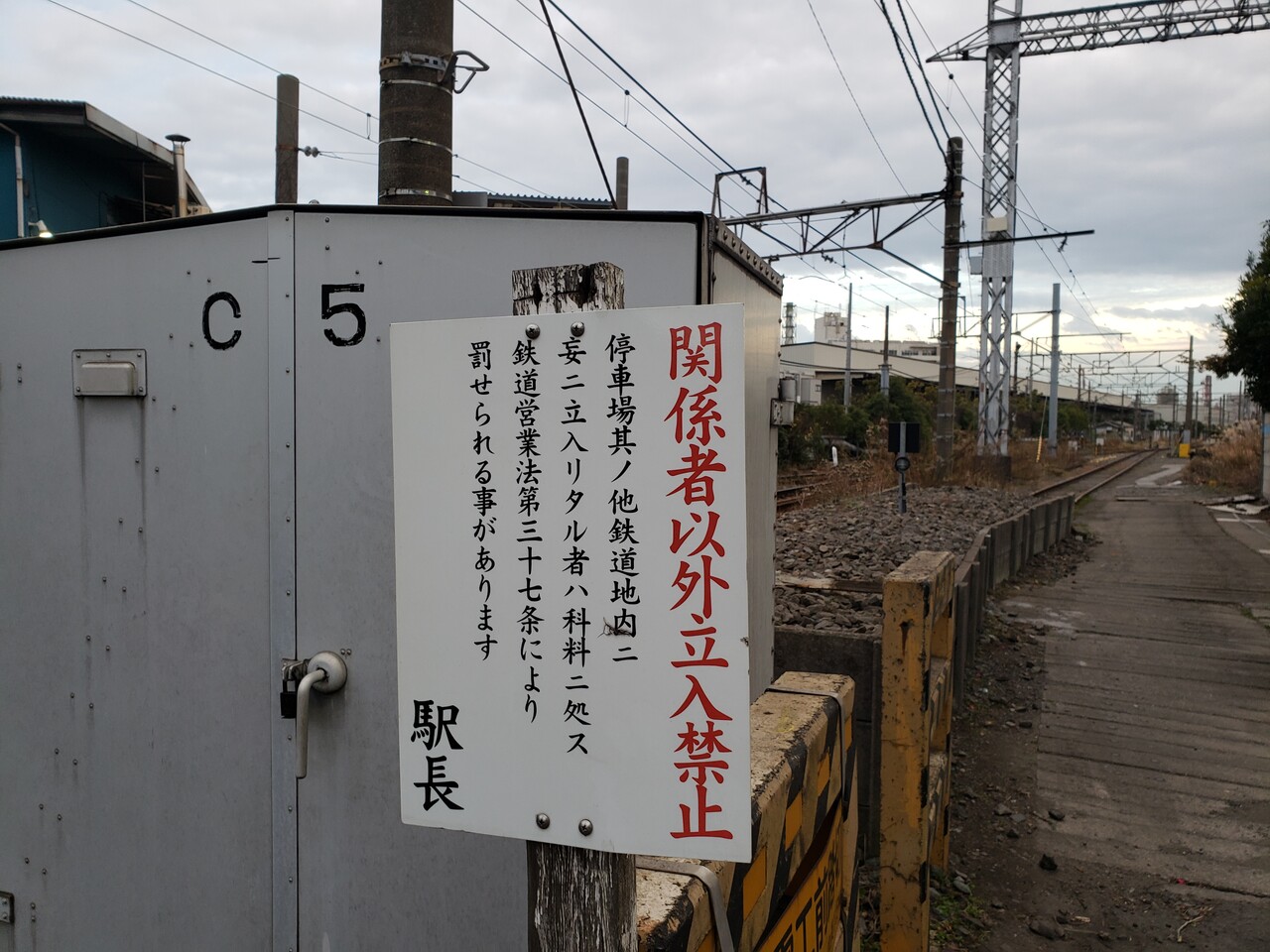踏切から見た駅構内の様子です。線路が2本並んでいますが、鶴見線電車が通るのは片側1本のみで、ホームが無い側の線路は浜川崎駅から扇町駅を結ぶ貨物線の線路です。複線っぽく見えますが、どちらも単線とのこと。