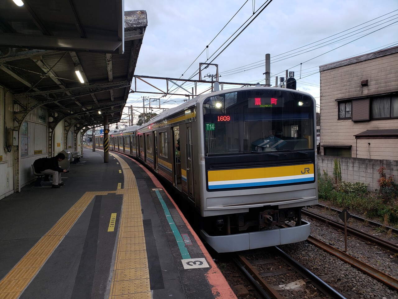 一見すると複線のように見えますが、プラットホームは片側にしかありません。旅客列車はホームがある側にしか発着しないので実質的には単線。向こう側の線路は浜川崎駅から扇町方向へ伸びる貨物線。単線の線路が並列になっているというのが正解です。