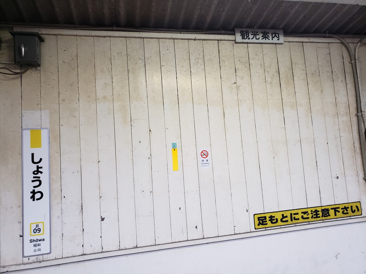 ホーム内の屋根を支える壁は改築する以前の駅舎のテイストを程よく残しています。ポスター掲示スペースのようで、「観光案内」の文字がここにかつて華やかな旅行気分を盛り上げるポスターが貼られていたことを偲ばせます。