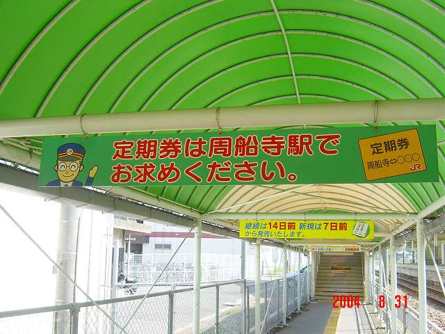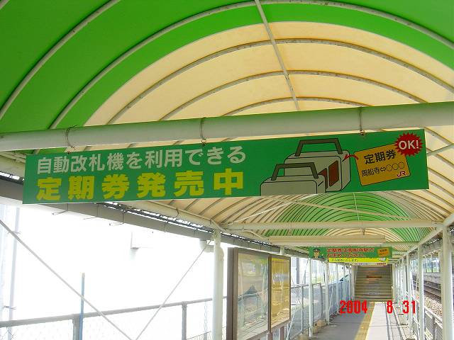 駅舎からホームまでは通路を通り跨線橋を渡りますが、訪問した2004年当時はその通路の屋根からこのような看板がぶらさがっていました。