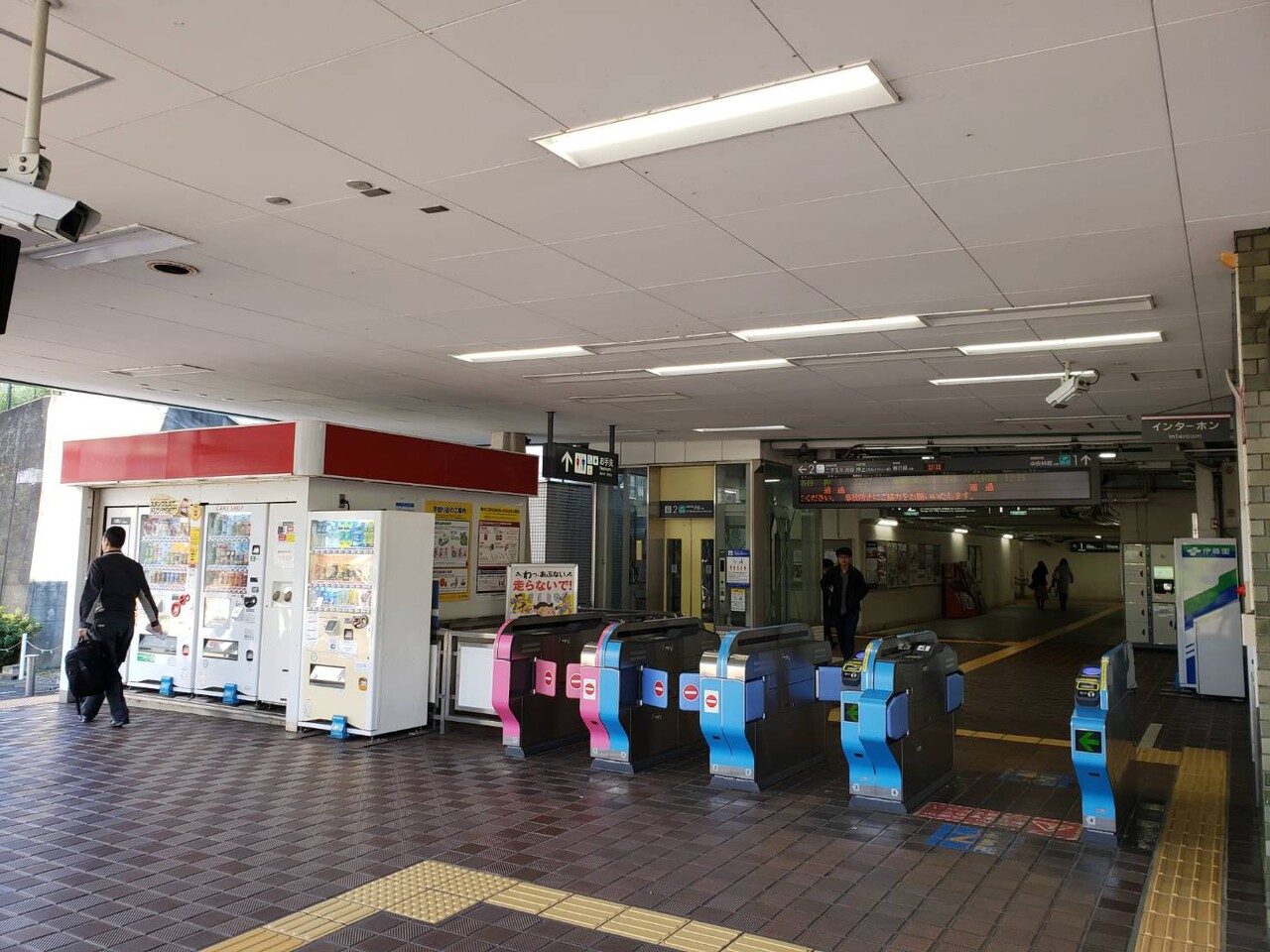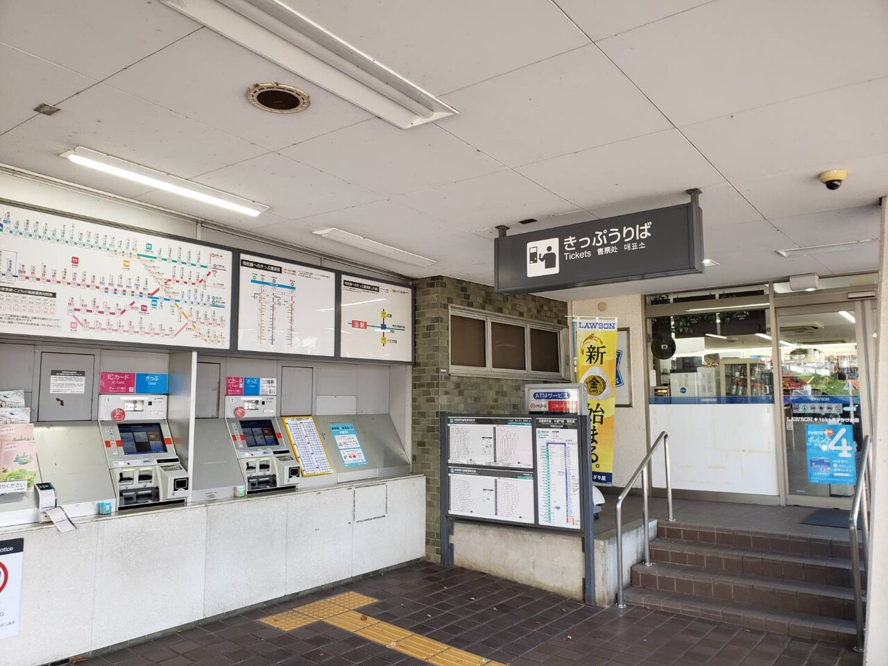 改札口は1か所です。以前は売店がありましたが、現在は飲料自販機が置いてあります。売店の代替としては自販機の他に駅舎内にコンビニエンスストアが出店しています。