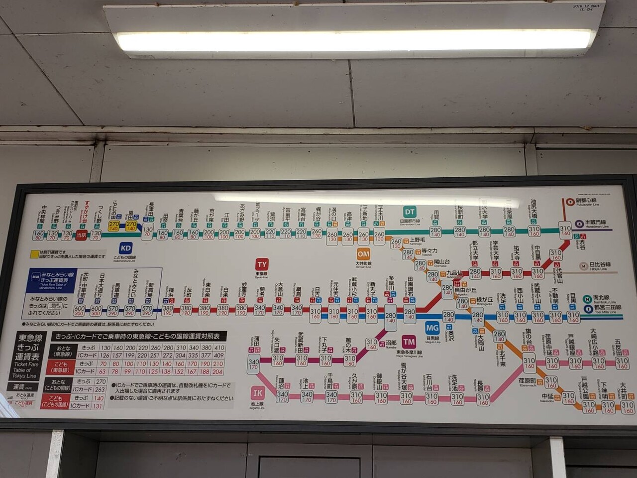 消費税改定後の運賃表です。当駅からの自社線最遠運賃は蒲田駅周辺までの340円。渋谷駅までは310円となっています。東急は金額式の回数券となっていたため、渋谷までのつもりで回数券を購入すると、その回数券で渋谷の他に東急多摩川線は矢口渡駅、池上線は久が原駅と五反田駅、大井町線は大井町駅、目黒線は目黒駅まで利用ができましたが、その回数券はごく一部の通信系学校への通学用を除き令和5年に廃止となっています。
